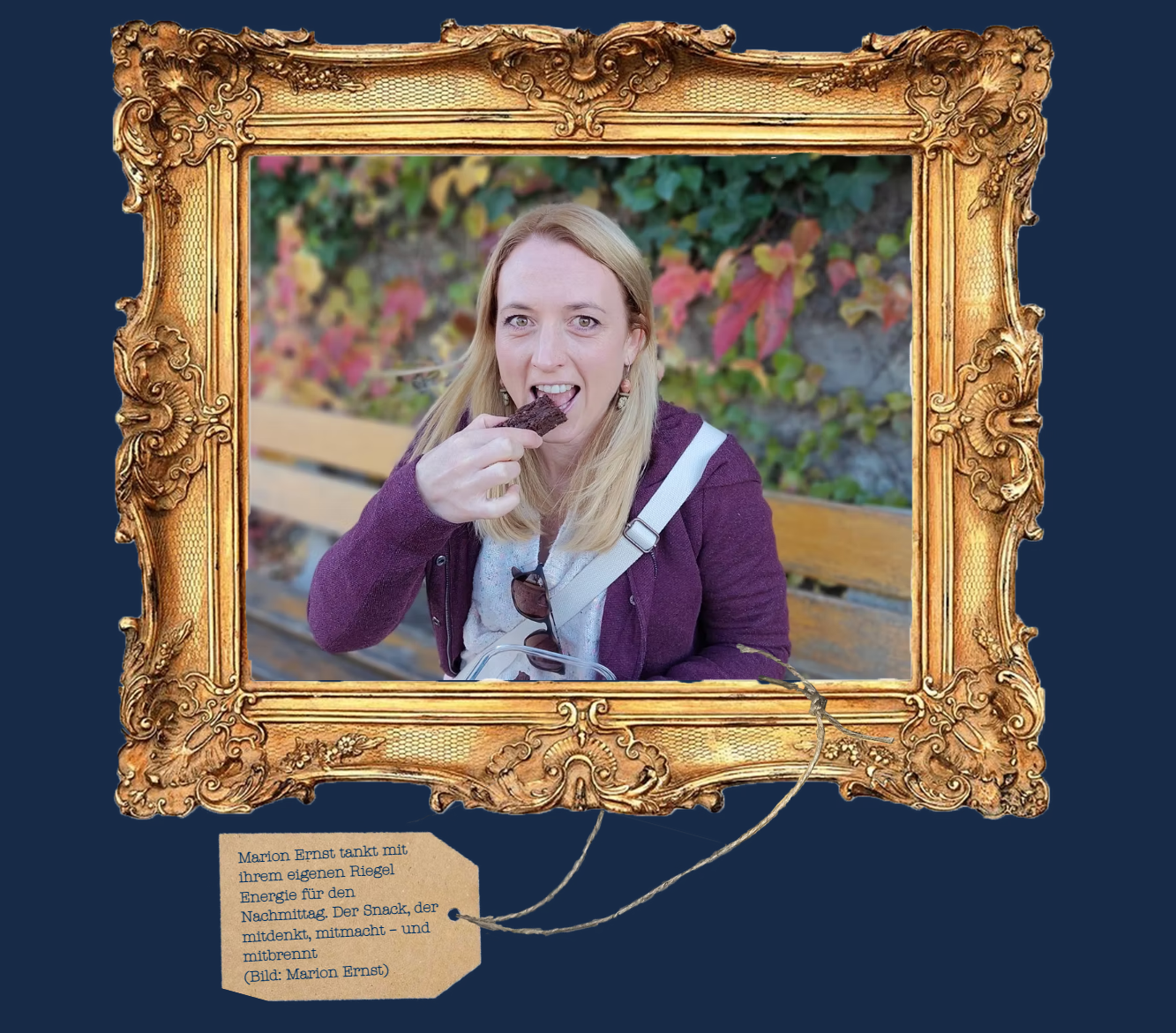 Marion tankt mit ihrem eigenen Riegel Energie für den Nachmittag. Der Snack, der mitdenkt, mitmacht – und mitbrennt.