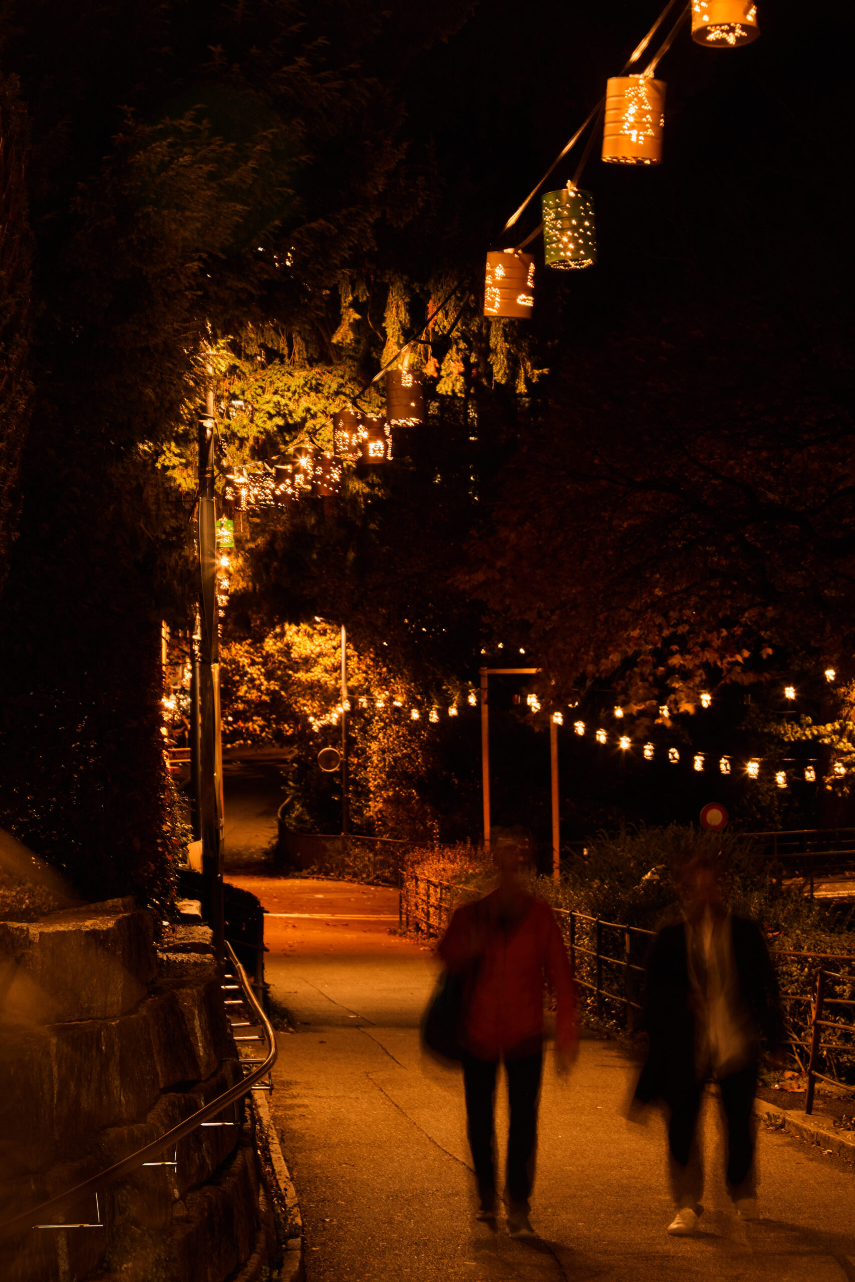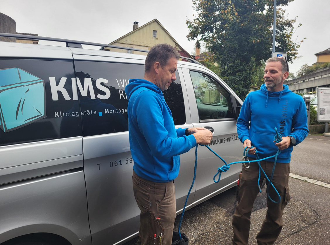 Damit der Latärnliweg leuchten kann, braucht es über 700 Meter Seil und viel handwerkliches Geschick. Michi und Stefan von KMS Wirz und Kistler GmbH spannen in rund 3 bis 4 Metern Höhe die Seile von Strassenlaterne zu Strassenlaterne, prüfen jede Verbindung und schaffen so die Grundlage für einen halben Kilometer Lichtzauber.