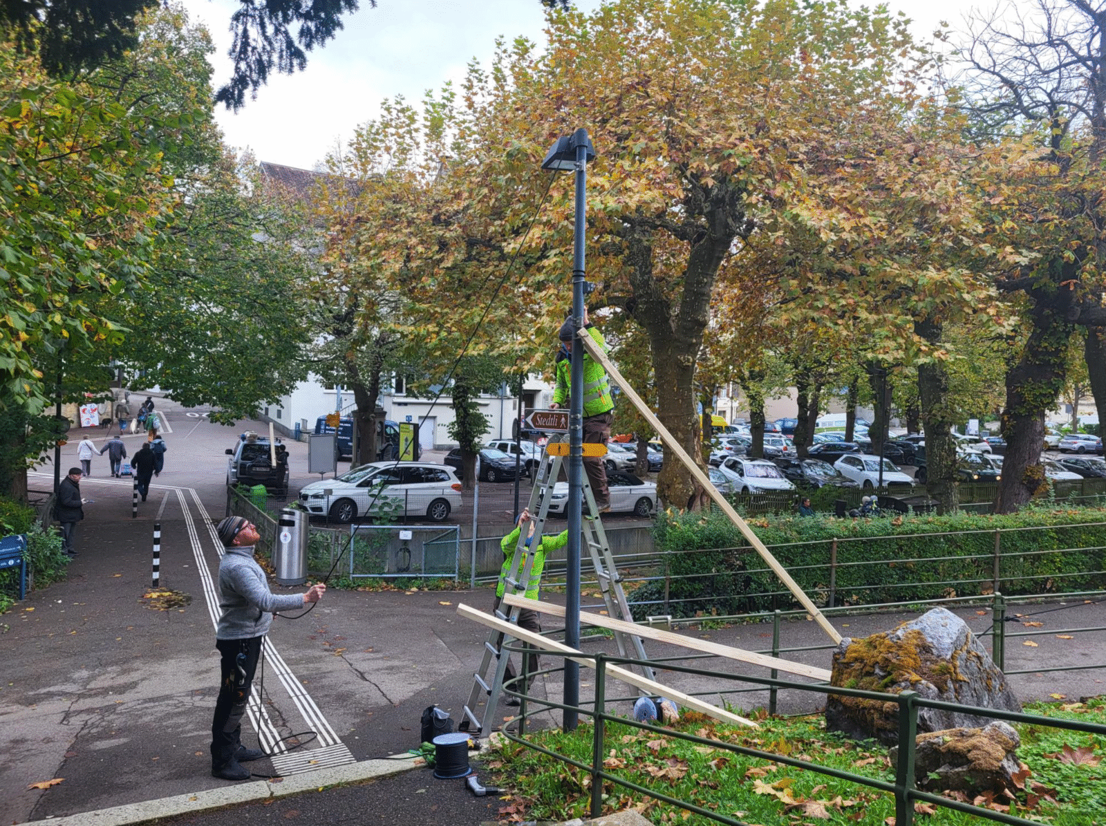 Befestigt wird an 19 Strassenlaternen, 9 Bäumen und 10 Zusatzpfosten – präzise Arbeit in luftiger Höhe, getragen von Erfahrung, Teamgeist und Herzblut.
