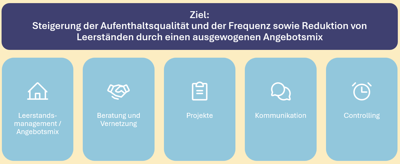 - Frischer Wind in leeren Räumen: In enger Abstimmung mit Eigentümern und Verwaltungen werden Leerstände aktiv angegangen um eine bunte Vielfalt an Angeboten zu schaffen.